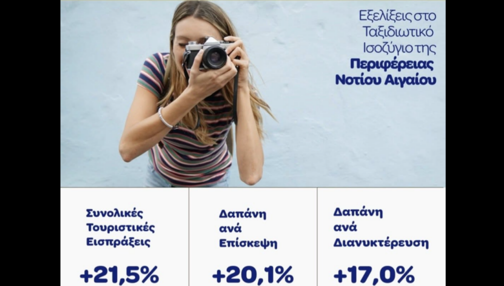 Σύμφωνα με τα στοιχεία της έρευνας που διενεργεί η Τράπεζα της Ελλάδος, οι *συνολικές τουριστικές εισπράξεις* στο Νότιο Αιγαίο το α’ εξάμηνο του 2025 ανήλθαν σε 1,82 δις ευρώ σημειώνοντας εντυπωσιακή αύξηση κατά 21,5%, ενώ στο σύνολο της Ελλάδος η αύξηση ανήλθε σε 11,3%. Το Νότιο Αιγαίο συνέβαλε κατά 25% στις συνολικές τουριστικές εισπράξεις της Ελλάδας.