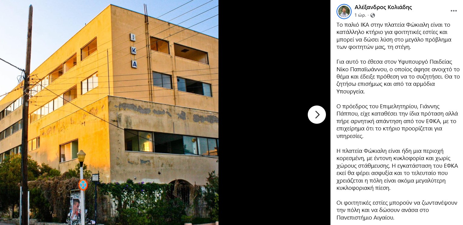 Η έλλειψη φοιτητικές στέγης αποτελεί ένα υπαρκτό πρόβλημα στη Ρόδο, το οποίο κάθε χρόνο παίρνει μεγαλύτερες διαστάσεις καθώς τα διαθέσιμα προς ενοικίαση ακίνητα σπανίζουν λόγω της δέσμευσής τους από τις βραχυχρόνιες μισθώσεις. Ο Δήμαρχος Ρόδου Αλέξανδρος Κολιάδης, με παρέμβασή του προς τον υφυπουργό Παιδείας Νίκο Παπαϊωάννου, ζητά τη μετατροπή του παλιού κτηρίου του ΙΚΑ στην Πλατεία Φώκιαλη σε φοιτητικές εστίες, επισημαίνοντας πώς πρόκειται για την καταλληλότερη λύση, η οποία έχει προταθεί και από άλλους φορείς όπως είναι το Επιμελητήριο Δωδεκανήσου. Ο Δήμαρχος επισημαίνει πώς η δρομολογούμενη μεταφορά του ΙΚΑ (ΕΦΚΑ) στο συγκεκριμένο χώρο, θα έχει ως αποτέλεσμα να προκληθεί κυκλοφοριακή ασφυξία στο κέντρο της πόλης, ενώ η λειτουργία του κτηρίου ως φοιτητική στέγη δεν θα επιφέρει τέτοια προβλήματα ενώ θα ενισχύσει τους φοιτητές, το πανεπιστήμιο. Παράλληλα οι φοιτητές και οι φοιτήτριες θα ζωντανέψουν με την παρουσία τους την πόλη.