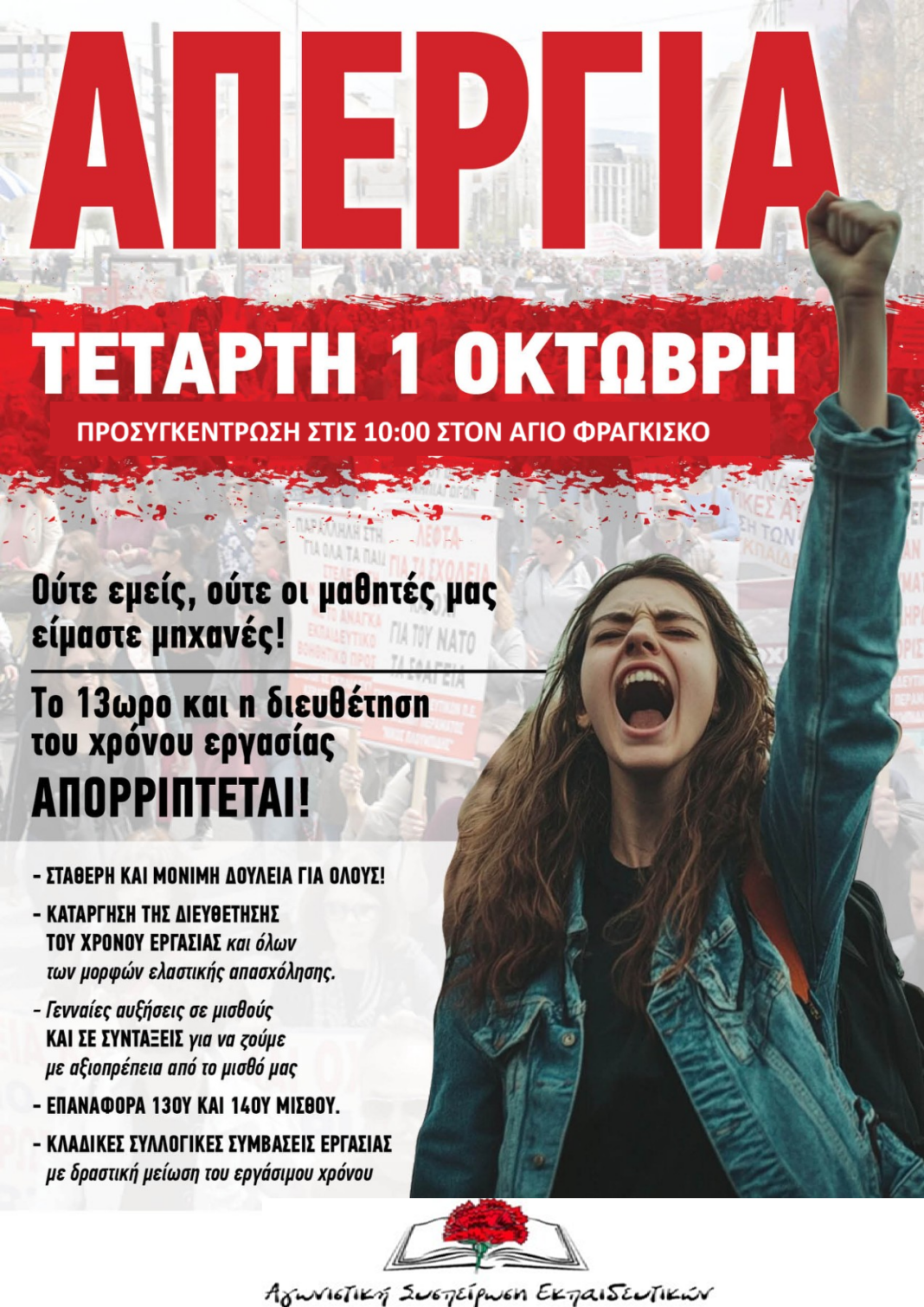 Την 1η Οκτωβρίου κλείνουμε όλα τα σχολεία. Κατεβαίνουμε όλοι και όλες στον δρόμο, για εμάς, για τις οικογένειές μας, για τους μαθητές μας. Υπερασπιζόμαστε τη ζωή και την αξιοπρέπειά μας! Στέλνουμε καθαρό μήνυμα: η πολιτική που μας γυρίζει στον μεσαίωνα, που μας καταδικάζει σε φτώχεια και εξάντληση, το νομοσχέδιο της κυβέρνησης για το 13ώρο, να πεταχτεί στα σκουπίδια.