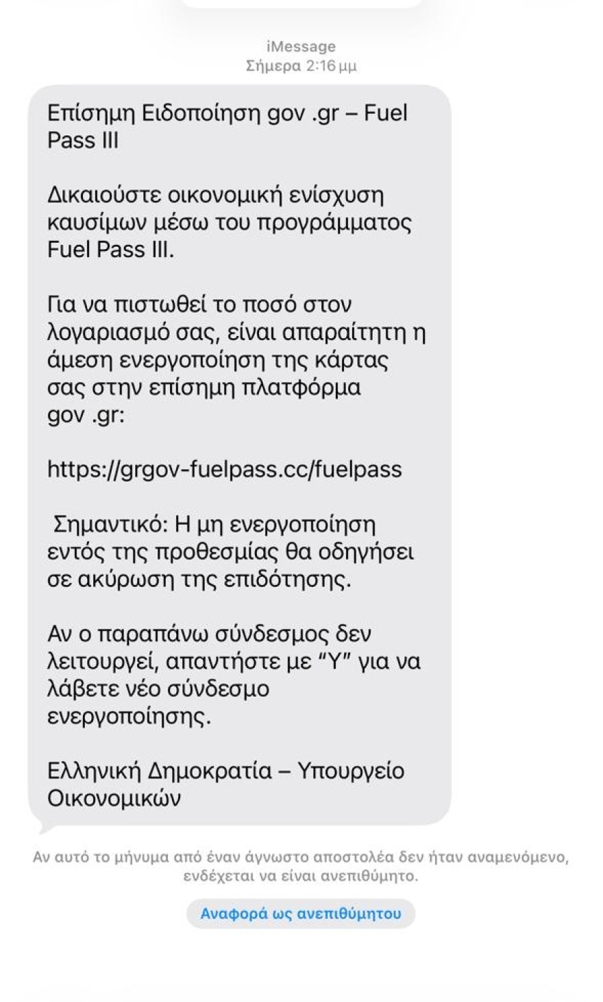 Στα παραπλανητικά μηνύματα, οι αποστολείς χρησιμοποιούν την ταυτότητα της πλατφόρμας gov.gr και καλούν τους πολίτες να πατήσουν σε σύνδεσμο προκειμένου δήθεν να «ενεργοποιήσουν» την κάρτα Fuel Pass III, ώστε να λάβουν κρατική οικονομική ενίσχυση.