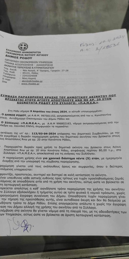 Με απερίγραπτη χαρά ήρθε η ώρα να ανακοινώσουμε στους καλούς μας φίλους στη Ρόδο και σε όλα τα Δωδεκάνησα πως από σήμερα μας παραχωρήθηκε δημοτικό οίκημα ως στέγη του Π.Α.Μ.Ε.Α στην περιοχή των Αγίων Αποστολών Άνω με αριθμό 20 στην Κοινότητα Ρόδου.