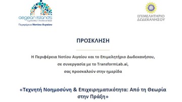 Η Περιφέρεια Νοτίου Αιγαίου και το Επιμελητήριο Δωδεκανήσου, σε συνεργασία με το TransformLab.ai, σας προσκαλούν στην ημερίδα «Τεχνητή Νοημοσύνη & Επιχειρηματικότητα: Από τη Θεωρία στην Πράξη» την Πέμπτη 30 Απριλίου 2026 | 18:30 – 20:30 στην Αίθουσα Επιμελητηρίου Δωδεκανήσου (Γρηγορίου Λαμπράκη 8, Ρόδος).