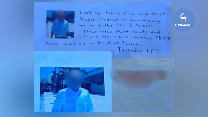 Η αγγελία που τοποθετήθηκε έξω από το σχολείο της Ρόδου, ανέφερε χαρακτηριστικά πως «αναζητώ αδύνατη, κοντή μαθήτρια για να μου κάνει παρέα σε περίπατο για δύο ώρες. Να φορά μπικίνι και σορτσάκι – Μη καπνίστρια. 15 ευρώ. Συνάντησέ με μπροστά από την Ταβέρνα. Πέμπτη στις 13:00»