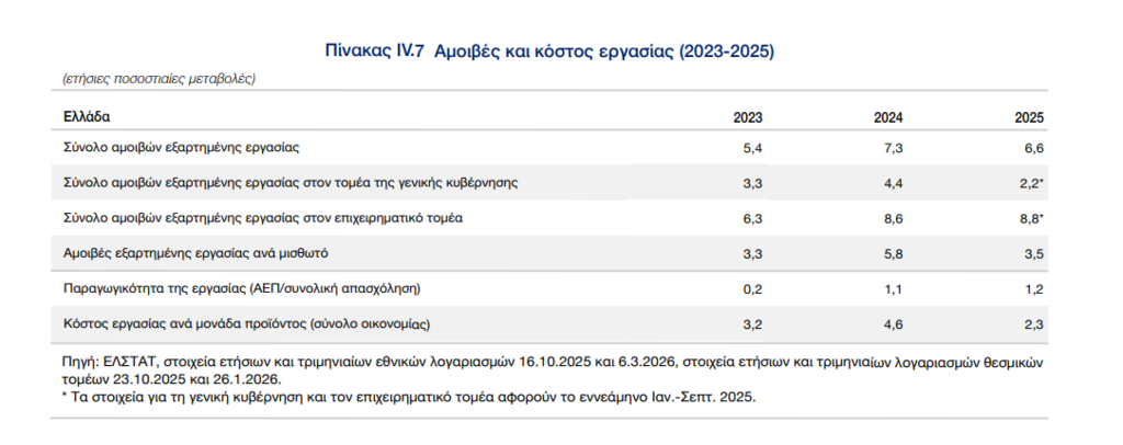 Η έκθεση του διοικητή της Τράπεζας της Ελλάδος δείχνει επιβράδυνση της αύξησης των αμοιβών ανά μισθωτό, όπως και του κόστους εργασίας. Συγκεκριμένα η έκθεση διαπιστώνει ότι κατά το 2025 επιβραδύνθηκε η αύξηση τόσο των συνολικών αμοιβών όσο και των αμοιβών ανά μισθωτό σε ονομαστικούς όρους. Οι αμοιβές αυξήθηκαν μόνο οριακά σε πραγματικούς όρους, με την αύξηση αυτή να προέρχεται από την μείωση των ασφαλιστικών εισφορών κατά μισή ποσοστιαία μονάδα για τους μισθωτούς από την 1.1.2025, καθώς και λόγω της μείωσης των ασφαλιστικών κρατήσεων επί των αμοιβών υπερωριών και υπερεργασίας.