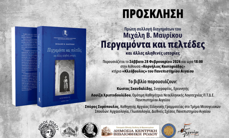 Αληθινές ιστορίες συνοδευόμενες με φωτογραφικό υλικό, που διαδραματίζονται στην Λίνδο, περιλαμβάνει το πρώτο βιβλίο του Μιχάλη Μαυρίκου «Περγαμόντα και Πελτέδες», που θα παρουσιαστεί αύριο Σάββατο 28 Φεβρουαρίου 2026 και ώρα 18:00 στην Αίθουσα «Κορνήλιος Καστοριάδης» κτήριο «Κλεόβουλος» του Πανεπιστημίου Αιγαίου