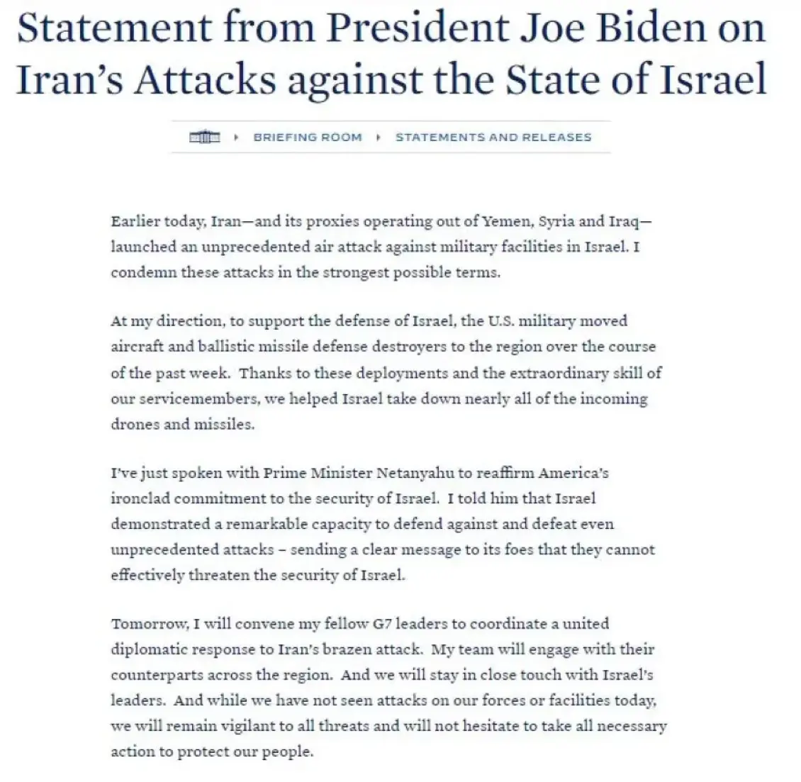 Κατόπιν δικής μου εντολής, για την υποστήριξη της άμυνας του Ισραήλ, ο στρατός των ΗΠΑ μετέφερε αεροσκάφη και αντιτορπιλικά αντιπυραυλικής άμυνας στην περιοχή κατά τη διάρκεια της περασμένης εβδομάδας. Χάρη σε αυτές τις αποστολές και την εξαιρετική ικανότητα των στρατιωτών μας, βοηθήσαμε το Ισραήλ να καταρρίψει σχεδόν όλα τα εισερχόμενα μη επανδρωμένα αεροσκάφη και πυραύλους.