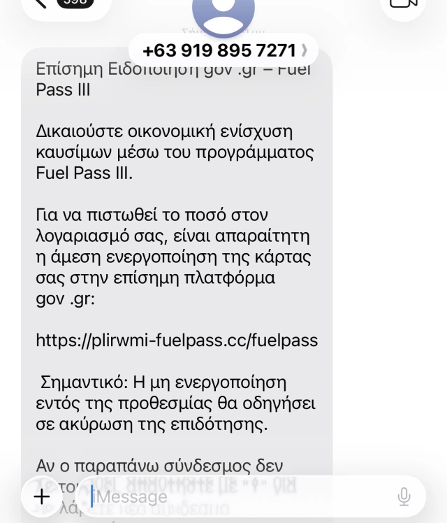 Νέα μορφή ηλεκτρονικής απάτης κάνει την εμφάνισή της τις τελευταίες ώρες, με επιτήδειους να στέλνουν μαζικά παραπλανητικά SMS που εμφανίζονται ως δήθεν επίσημες ειδοποιήσεις για το πρόγραμμα Fuel Pass III.