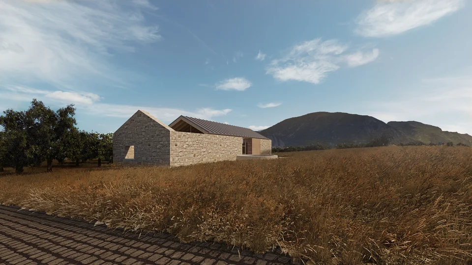 Οι αρχιτέκτονες του Γραφείου P4architecture, Αλκιβιάδης Πυλιώτης, Κωνσταντίνος Πυλιώτης, Ευάγγελος Φωκιάλης, Παναγιώτα Κυριακού, εφαρμόζοντας αυτή τη μαγική ιδιότητα του design, είδαν σε έναν εγκαταλελειμμένο αχυρώνα, που έστεκε σιωπηλός και ετοιμόρροπος, αφημένος στη λήθη, ένα εν δυνάμει μοντέρνο καταφύγιο το οποίο θα κρυβόταν μέσα σε ένα παλιό πέτρινο κέλυφος.
