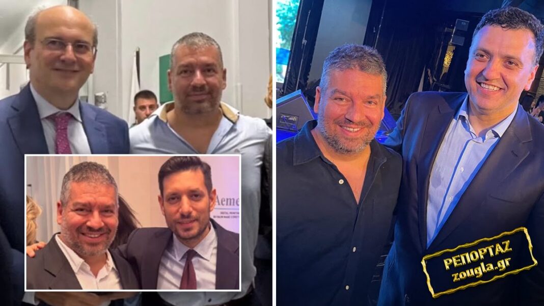 Ο επιχειρηματίας, ιδιοκτήτης Spa, που φέρεται να είναι ο υπαρχηγός της συμμορίας, ο Ευάγγελος Βουγιουκλάκης, φωτογραφίζεται χαμογελαστός με τρεις εμβληματικούς υπουργούς της κυβέρνησης Μητσοτάκη. Τον Κωστή Χατζηδάκη, αντιπρόεδρο της κυβέρνησης, πρώην υπουργό Οικονομικών και απόλυτο αφεντικό στο Μαξίμου, τον Βασίλη Κικίλια, νυν υπουργό Ναυτιλίας και Νησιωτικής Πολιτικής, και τον λαλίστατο υπουργό Μεταφορών, Κωνσταντίνο Κυρανάκη.