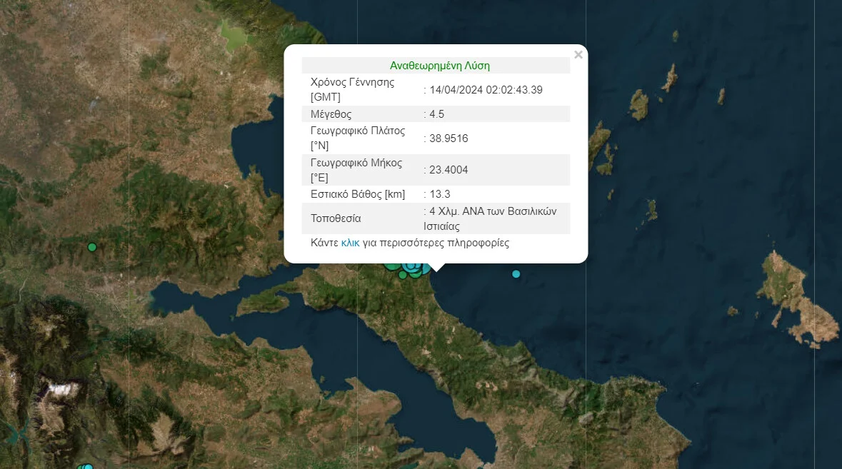Σύμφωνα με το Γεωδυναμικό Ινστιτούτο, ο σεισμός σημειώθηκε στις 5:02 τα ξημερώματα, με το επίκεντρό του να εντοπίζεται 4χλμ. ανατολικά της περιοχής Βασιλικά τη Ιστιαίας στη βόρεια Εύβοια και το εστιακό βάθος του να υπολογίζεται στα 13,3 χλμ. Και αυτή τη φορά έγινε αισθητός στην Αττική.