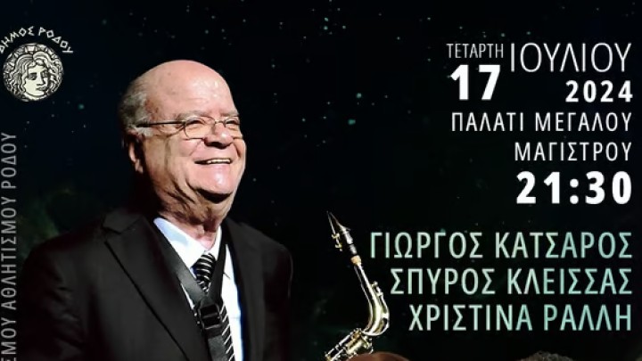 Η Διεύθυνση ΔΟΠΑΡ του Δήμου Ρόδου παρουσιάζει την Τετάρτη 17 Ιουλίου 2024 στις 21:30 τον δημοφιλή βιρτουόζο σαξοφωνίστα Γιώργο Κατσαρό στον εμβληματικό χώρο του Παλατιού του Μεγάλου Μάγιστρου.