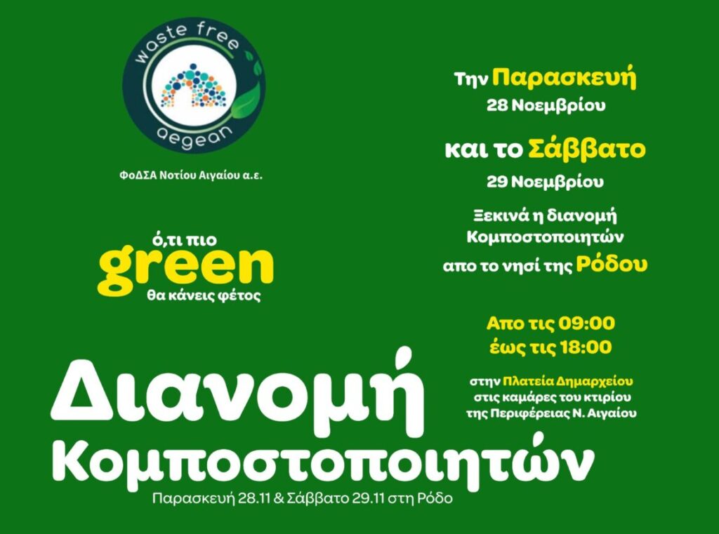 Η αρχή θα γίνει Ρόδο, με ένα διήμερο αφιερωμένο στο περιβάλλον, την κυκλική οικονομία και την ενεργή συμμετοχή των πολιτών. Την προσεχή Παρασκευή και το Σάββατο, 28 και 29 Νοεμβρίου, από τις 09:00 έως τις 18:00, στην Πλατεία Δημαρχείου, ο χώρος κάτω από τις καμάρες του Διοικητηρίου της Περιφέρειας Νοτίου Αιγαίου, θα μετατραπεί σε ένα ανοιχτό σημείο συνάντησης, ενημέρωσης και διανομής όπου οι πολίτες που υπέβαλαν αίτηση μέσω της ψηφιακής πλατφόρμας www.wastefreeaegean.gr/biowaste και κρίθηκε ότι πληρούν τα κριτήρια που θέτει το Πρόγραμμα, θα έχουν τη δυνατότητα να παραλάβουν τον δικό τους κομποστοποιητή εντελώς δωρεάν και να ενημερωθούν αναλυτικά για τον τρόπο με τον οποίο μπορούν να μετατρέπουν τα οργανικά υπολείμματα της κουζίνας και του κήπου τους σε φυσικό λίπασμα, μειώνοντας σημαντικά των όγκο των απορριμμάτων που θα οδηγηθούν σε ταφή. Σημειώνεται ότι όσοι επιθυμούν να μπουν στο Πρόγραμμα του οικιακού κομποστοποιητή και δεν έχουν υποβάλει ακόμη αίτηση, θα μπορούν να ενημερωθούν και να την υποβάλουν επιτόπου, παραλαμβάνοντας άμεσα τον δικό τους!