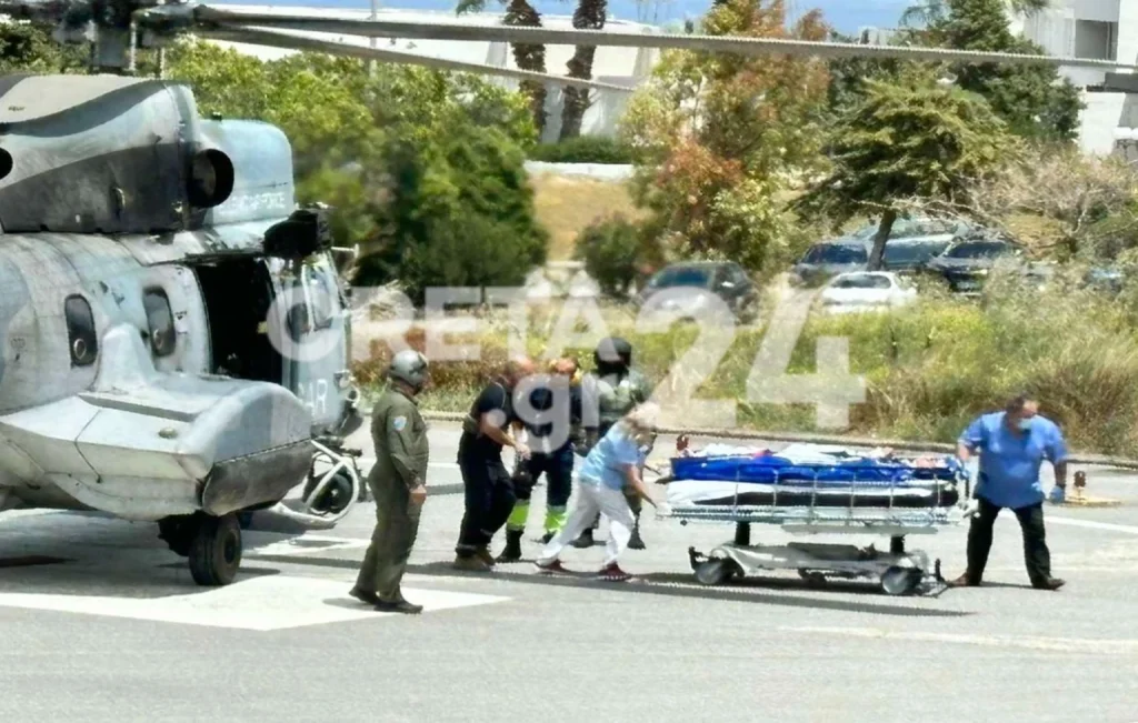 Ο πολυτραυματίας, μεταφέρθηκε με ελικόπτερο Super Puma της Πολεμικής Αεροπορίας το οποίο προσγειώθηκε στο ελικοδρόμιο του νοσοκομείου στις 13:25.
