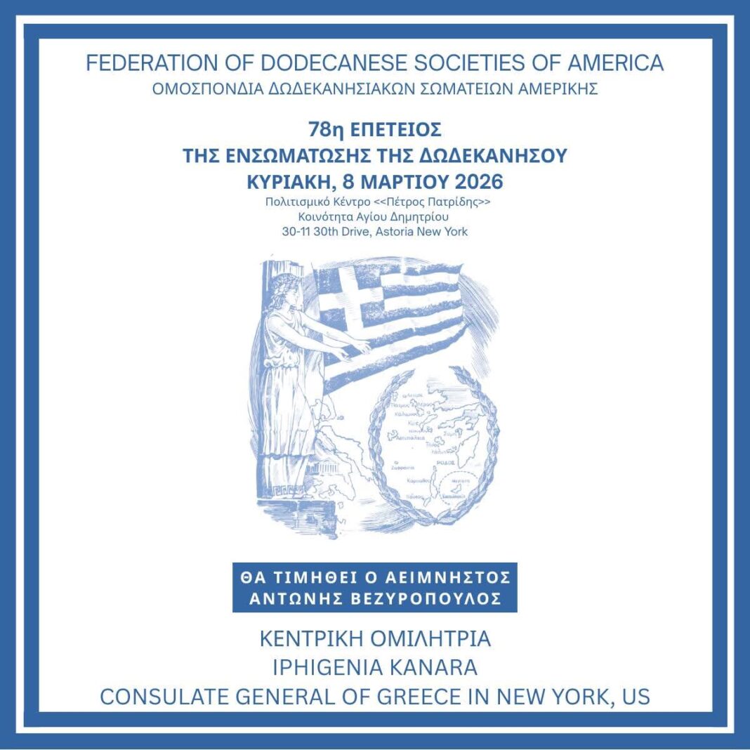 Με ιδιαίτερη τιμή, η Δωδεκανησιακή Ομοσπονδία Αμερικής ανακοινώνει τον φετινό εορτασμό της 78ης Επετείου της Ενσωμάτωσης της Δωδεκανήσου με τη Μητέρα Ελλάδα.